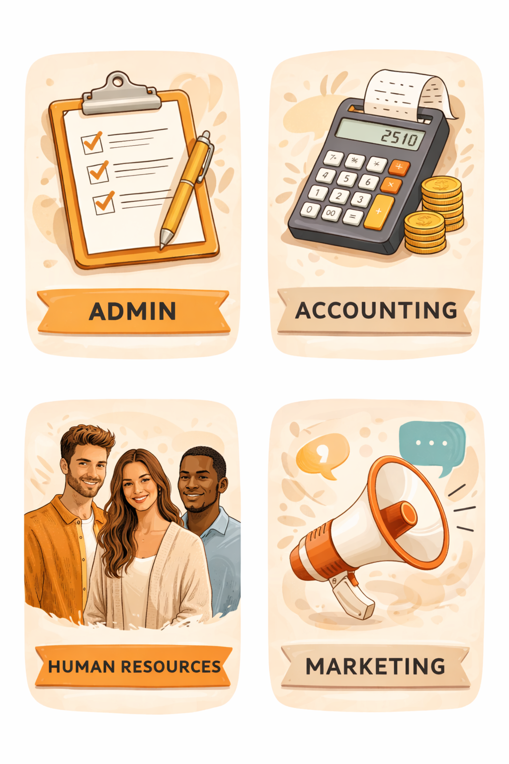 Administration — We handle the day-to-day so nothing falls through the cracks. Accounting — Clear books, organized finances, and no more money stress. Human Resources — The right foundations for hiring, managing, and growing your team. Marketing — Your message, your audience, your growth — with a strategy that actually fits you.